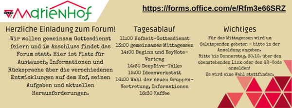 Wir wollen gemeinsam Gottesdienst feiern und im Anschluss findet das Forum statt. Hier ist Platz für Austausch, Informationen und Rücksprache über die verschiedenen Entwicklungen auf dem Hof, seinen Aufgaben und aktuellen Herausforderungen.